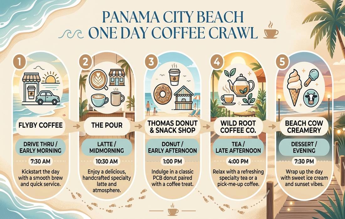 If you want to taste your way through the best coffee shops in Panama City Beach in a single trip, here is the route we recommend to our guests: