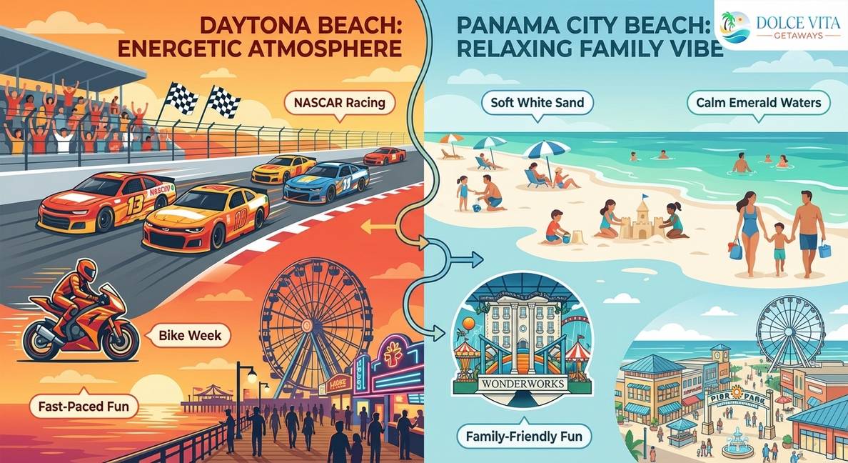 Florida is home to some of the most beautiful coastlines in the world. At Dolce Vita Getaways, we love helping guests plan their perfect escapes. When planning a trip, many people find themselves comparing Daytona Beach vs Panama City Beach.