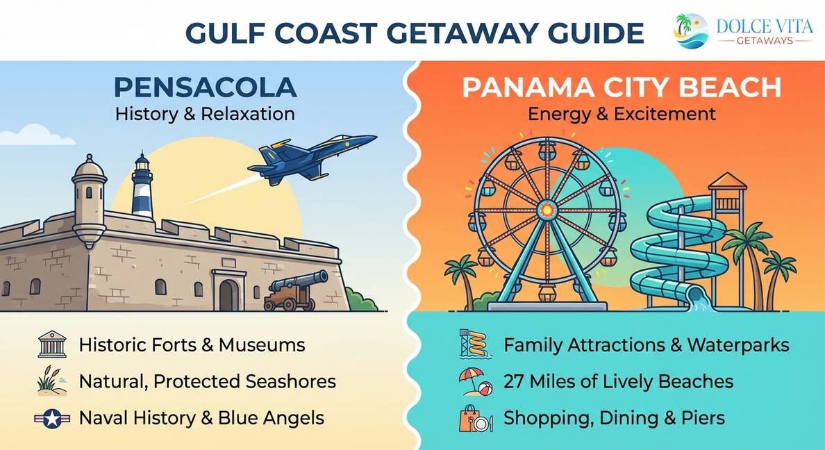 At Dolce Vita Getaways, we have been welcoming guests to the coast since 2006. We love helping travelers find their happy place. In this guide, we will compare Panama City Beach vs Pensacola to help you decide which one is right for you.