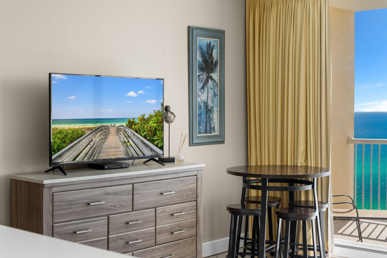 You'll have access to convenient amenities like a Smart TV, access to 650 feet of pristine beachfront. The resort features both indoor and outdoor pools, a well-equipped gym, hot tubs, tennis courts, a bar, and a movie theater!