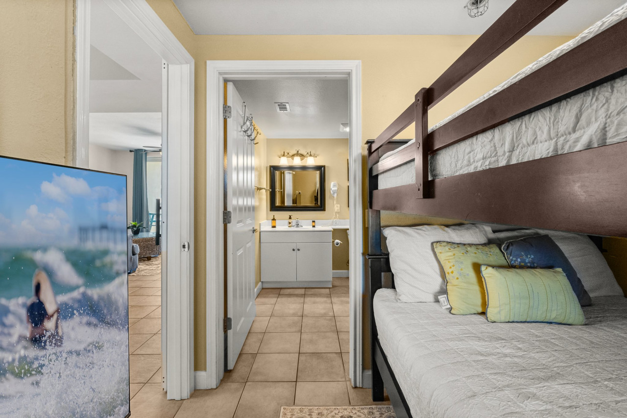 → Charming second bedroom with bunk beds, complete with a stylish barn door for added privacy.
