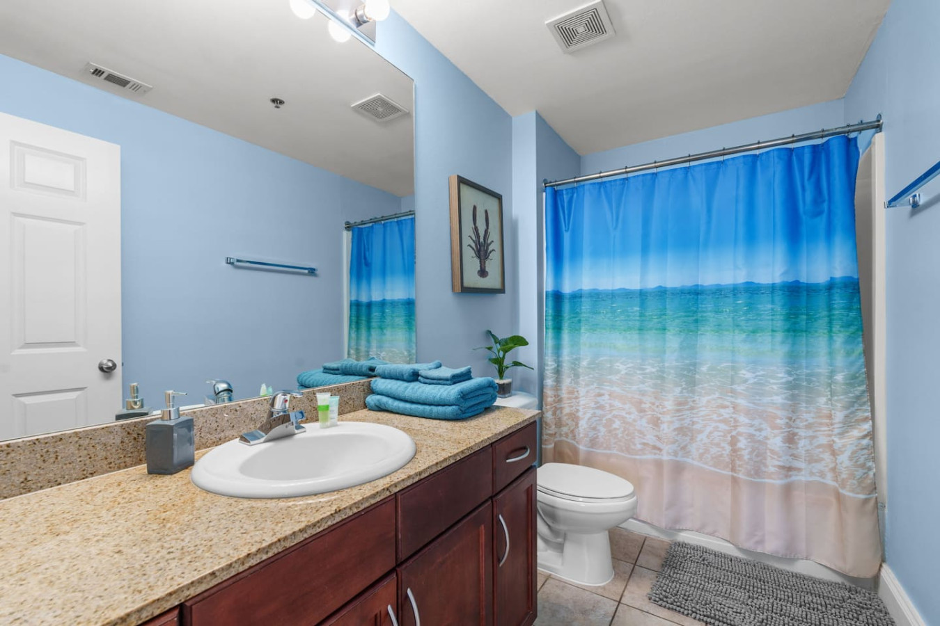 → Master Bathroom – Granite vanity, shower/tub combo, and coastal-inspired décor.
