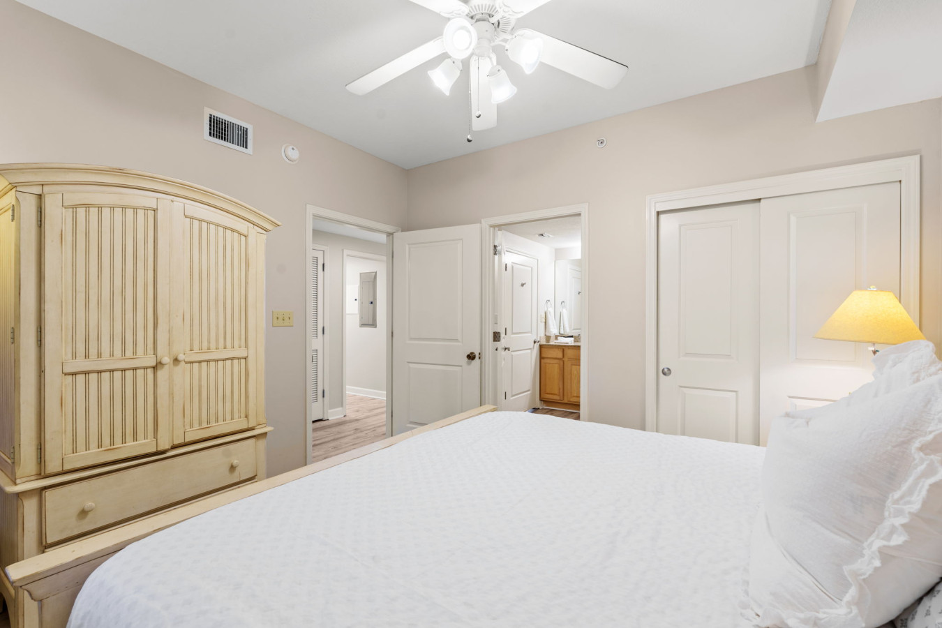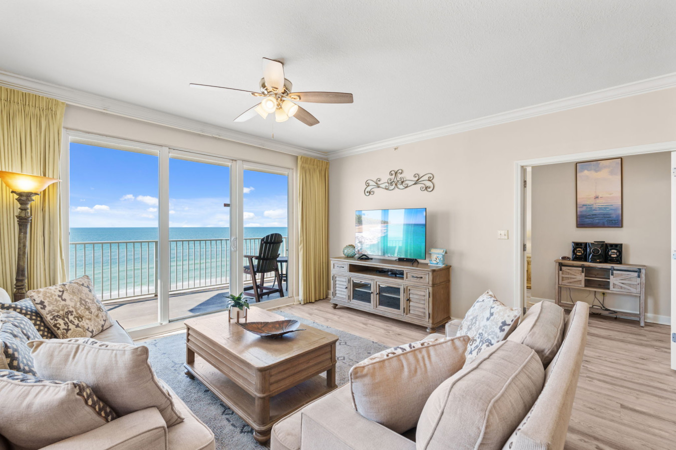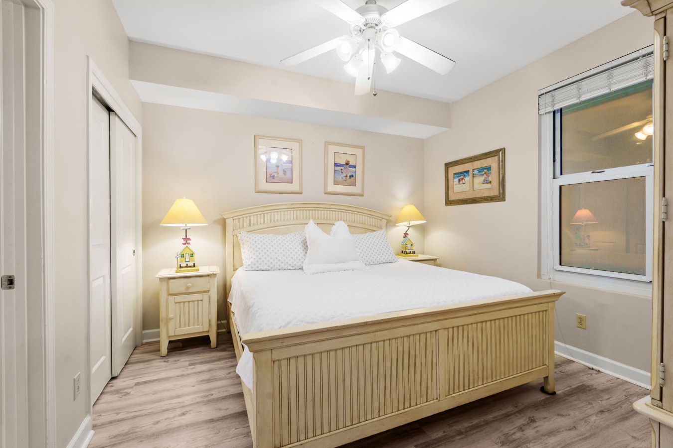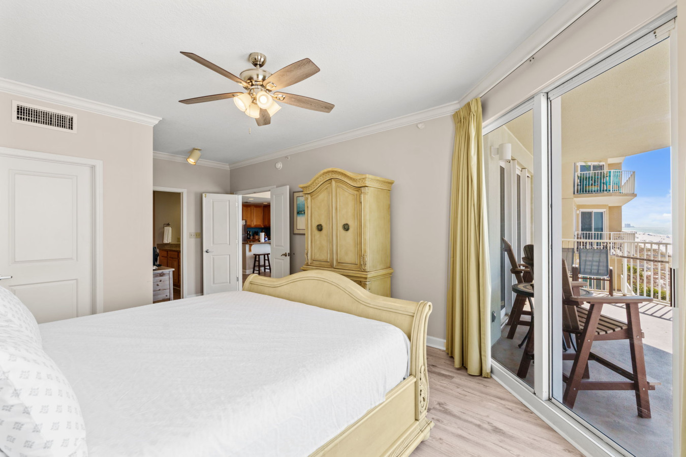 🛏️ Elegant Master Suite – Relax in a luxurious king-size bed with stunning Gulf views and private balcony access for the ultimate retreat.