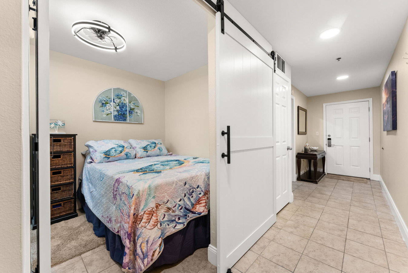 → Guest Bedroom – Cozy bunk room with barn-style door and its own private full bathroom (no window).
