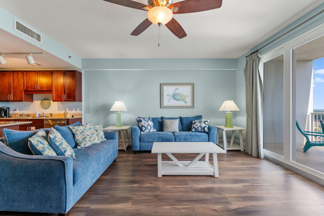 🛋️ Coastal Living Room – Relax in the bright coastal-style living area featuring a queen-size sleeper sofa, plush seating, and beachy décor.