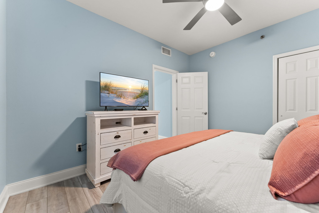 🛏️ Queen bed in the guest bedroom offering comfort and plenty of storage