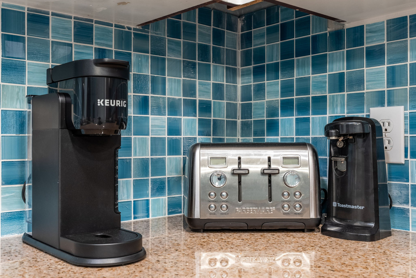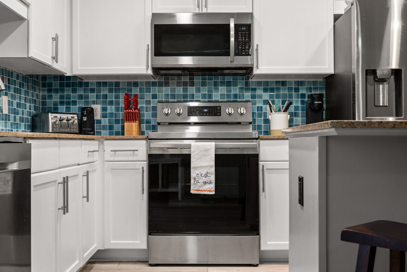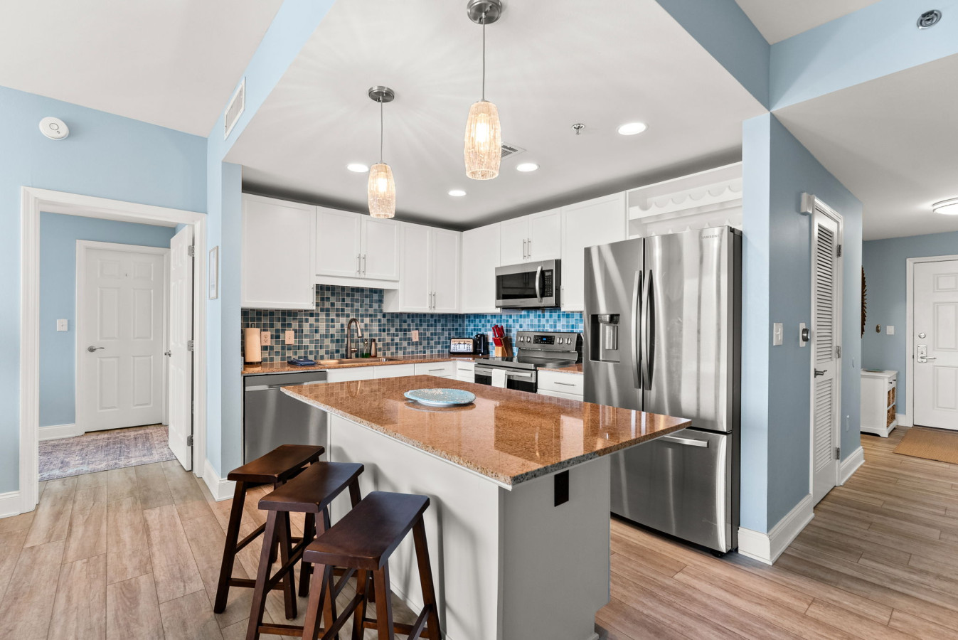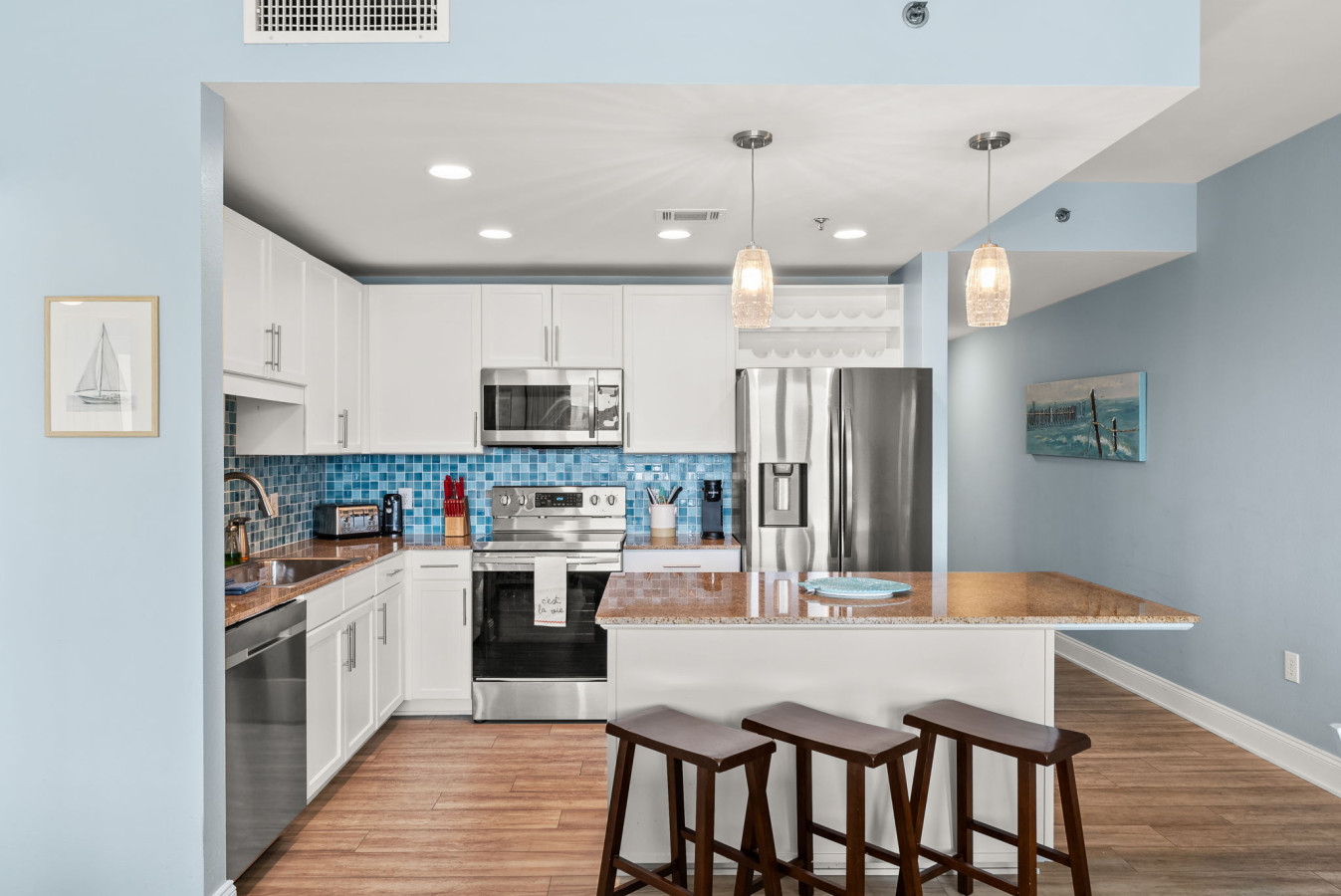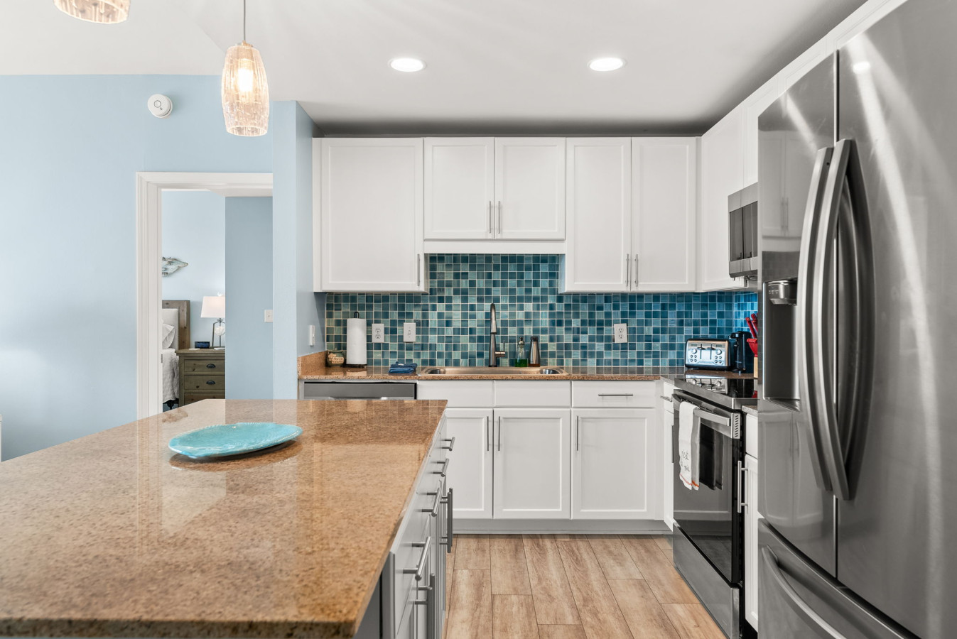 🍳 Fully equipped kitchen featuring stainless-steel appliances, granite countertops, a full oven and range, microwave, dishwasher, coffee maker, toaster, blender, cookware, dinnerware, and all the essentials for preparing home-cooked meals or beach-day snacks