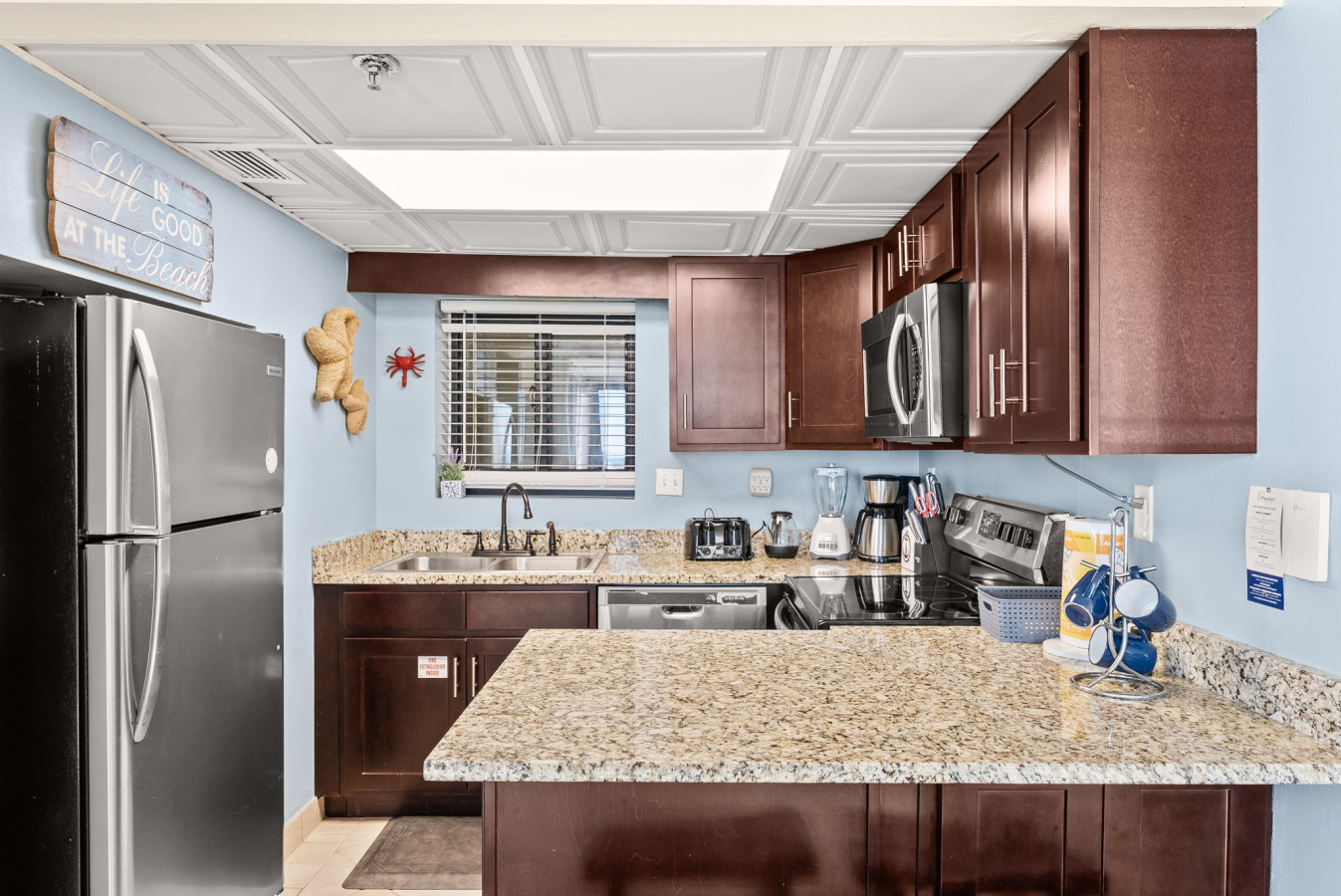 → Fully equipped kitchen with granite countertops and bar seating