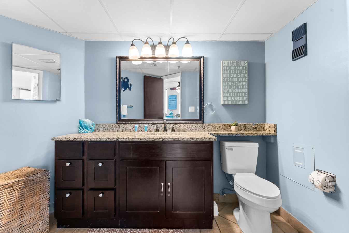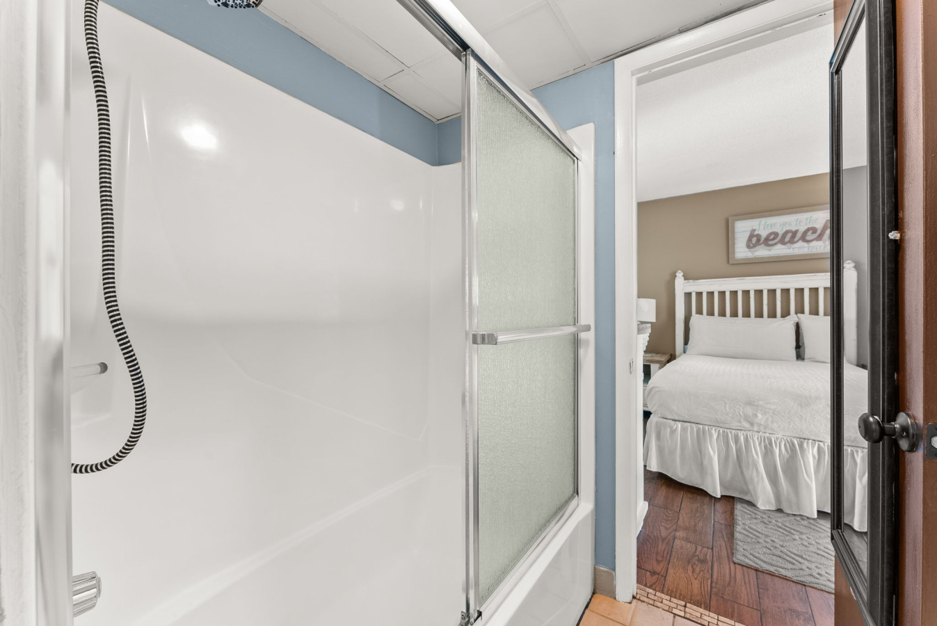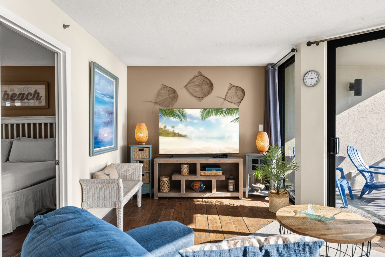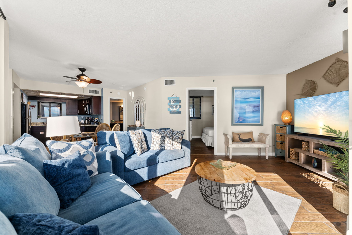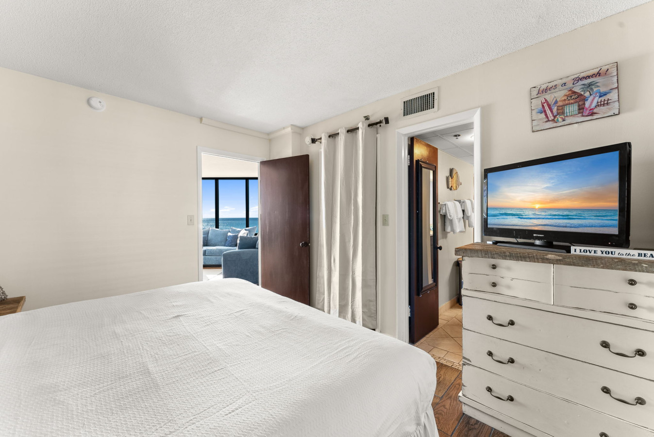 → Primary Bedroom: King bed, coastal décor, and flat-screen TV