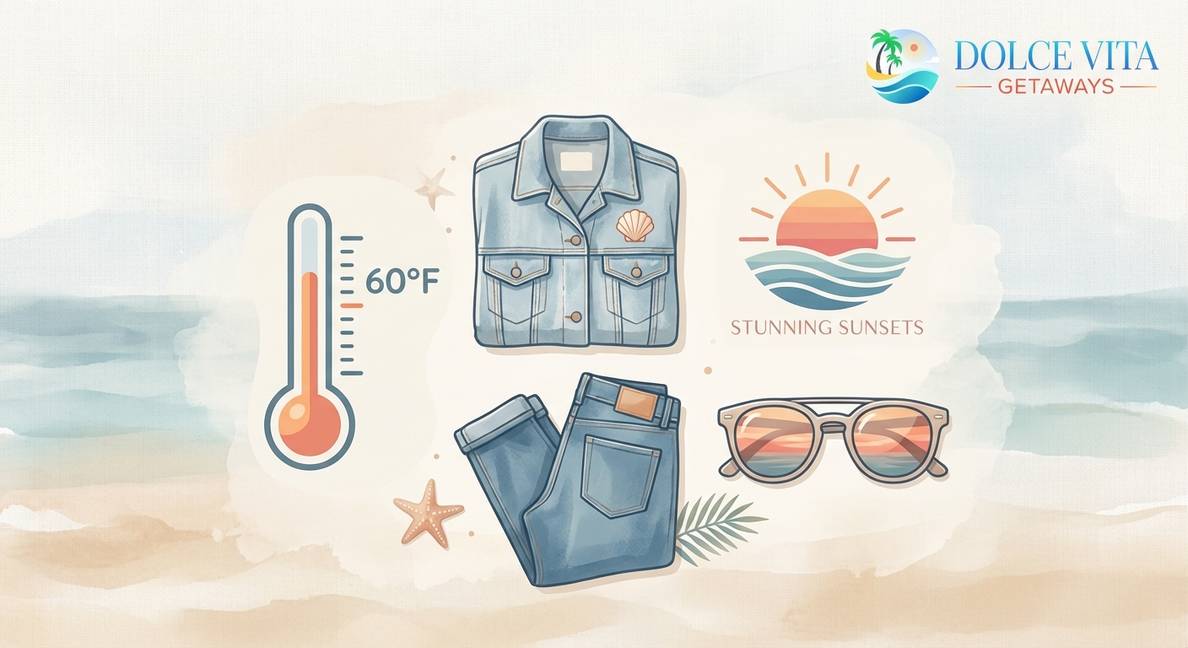 It is usually cool but comfortable. Daytime highs are often in the 60s. You will want a light jacket or sweater, especially for evening beach walks.