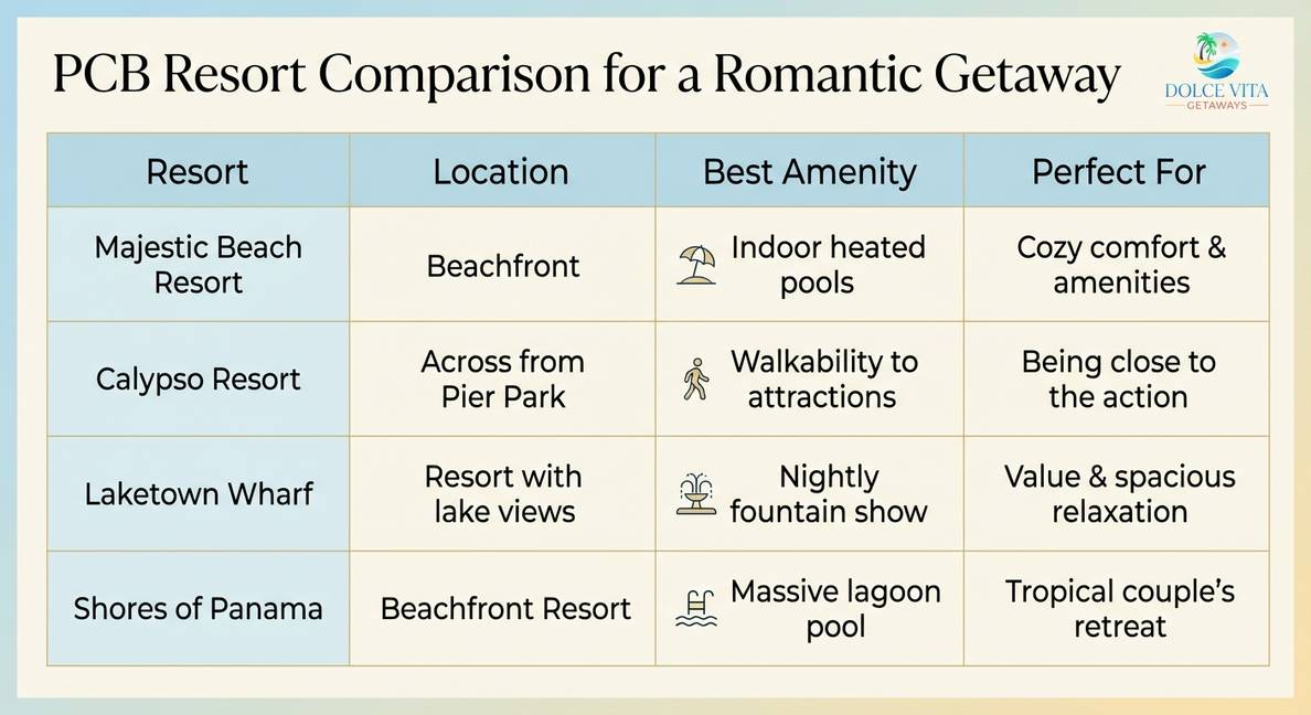We recommend staying beachfront. Waking up to the sound of the ocean is very romantic. Resorts like Calypso or Majestic offering indoor pools and hot tubs are great choices for cooler weather.