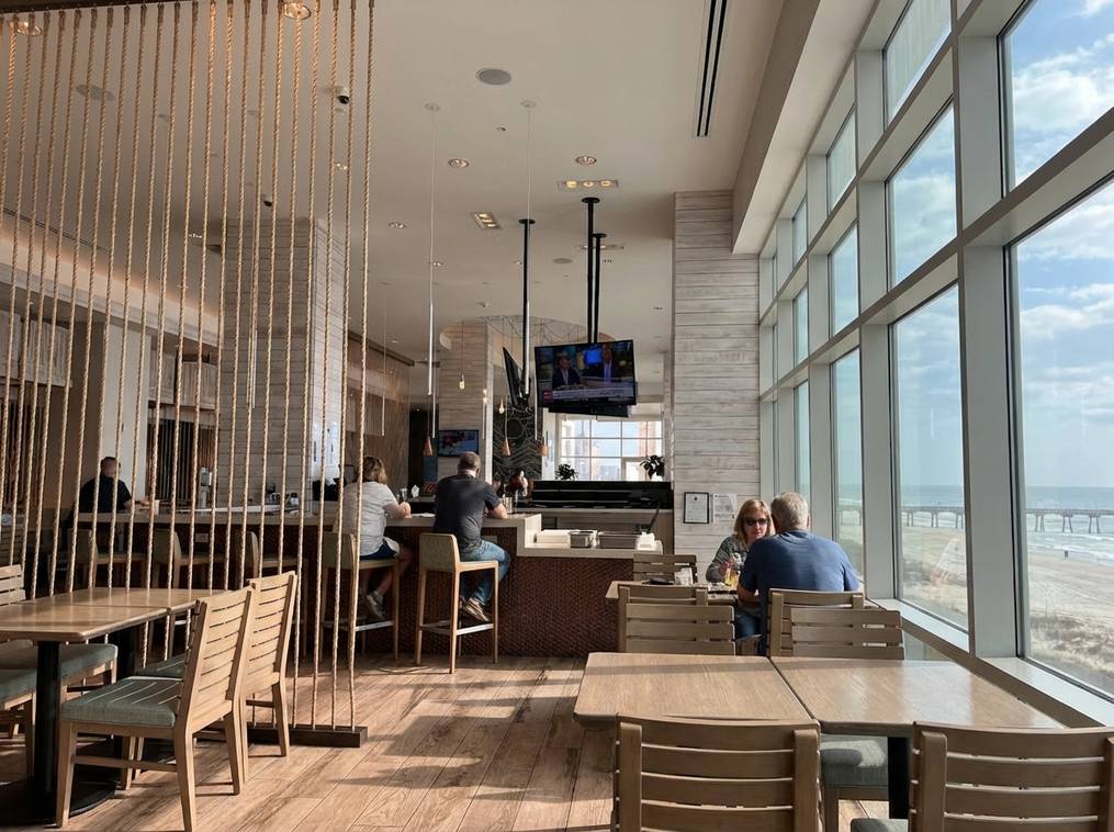 If you want to look at the ocean while you eat, this is a great choice. It is located right on Front Beach Road. The vibe is beach-elegant but still welcoming.
