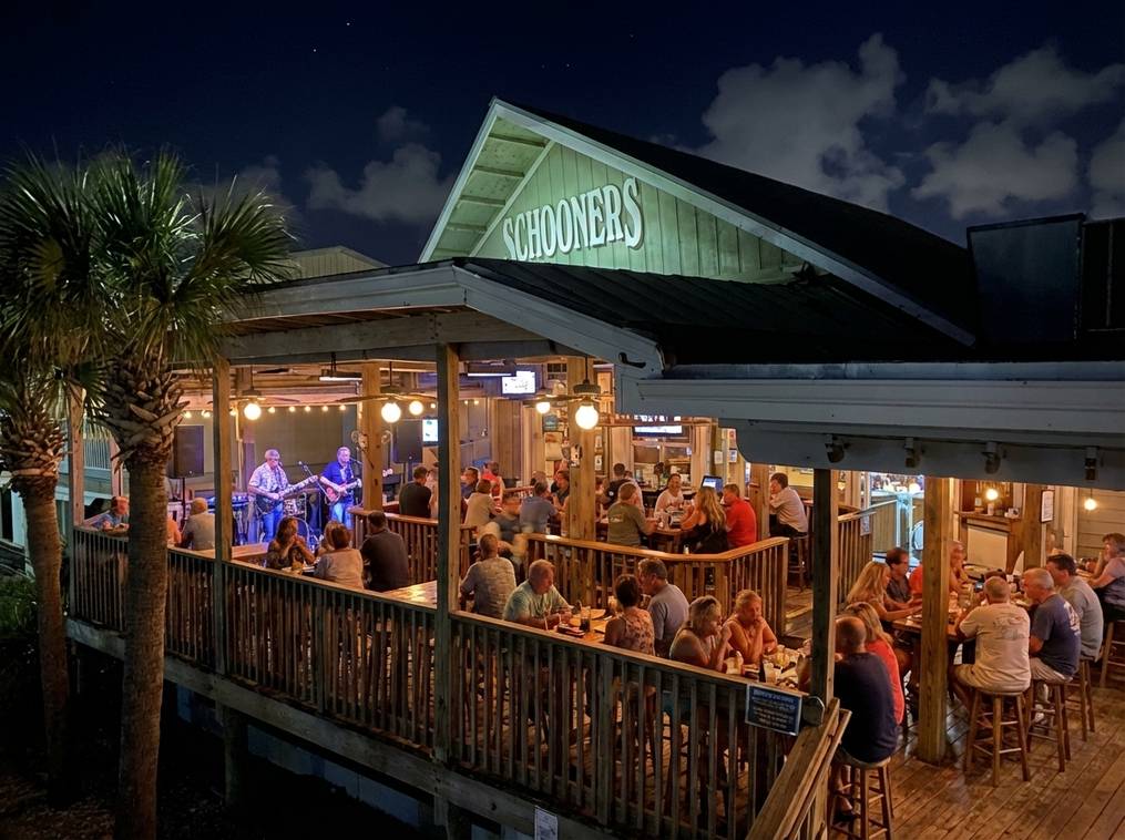 There are many great choices for dinner. For fresh seafood and waterfront views, Schooners and Saltwater Grill are very popular. If you want a more romantic setting, Firefly offers an upscale menu and a beautiful dining room.